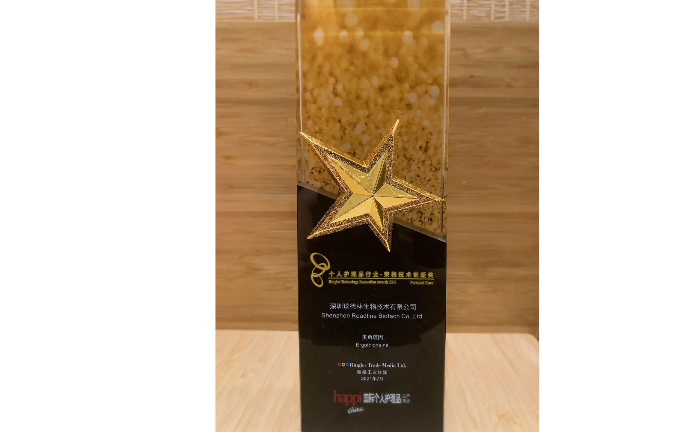 As one of the company's star products, Readline's L-Ergothioneine successfully won the 17th Ringier 2021 on July 14, 2021, with its overwhelming advantages such as technological innovation, stable quality, safety and no residue, and green environmental protection. Technology Innovation Award in the Functional Ingredients category for the Personal Care Industry.